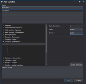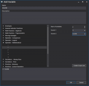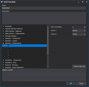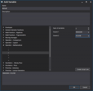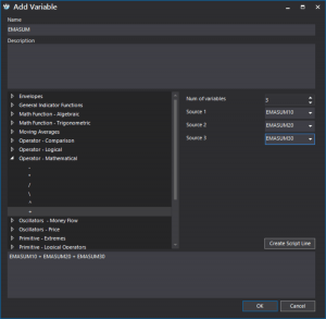 Let us look at an example of a simple script built using the script wizard measuring the average percentage deviation of three moving averages for 10, 20 and 30 periods, respectively, from closing prices: